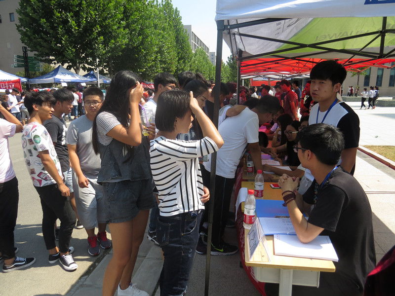 在学生会招新现场,学生会各个部门都吸引着许多新生前来报名,由于新同学正在军训他们只能在中午进行现场报名,虽然顶着炎热的太阳,但也阻止不了同学们加入学生会的热情,每个同学都对大学生活充满着梦想,想通过学生会这个平台锻炼自己、施展自己。各部门部长也都尽职尽责,耐心地给每一个新生介绍部门职能,讲解部门特色。通过两天的招新活动,各个部门招新都收获累累。