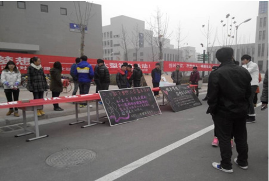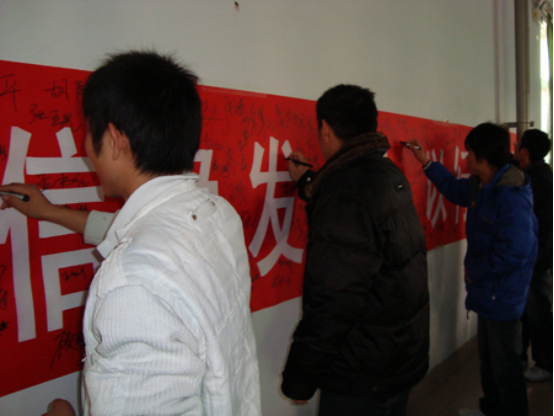 为了进一步加强我校大学生诚信教育,促使大学生心理健康成长,积极响应学校诚信月的活动,由公路学院心理部主办的“放飞梦想,诚信为先”大型签字活动,于12月17日中午,在学校餐厅门口举行。