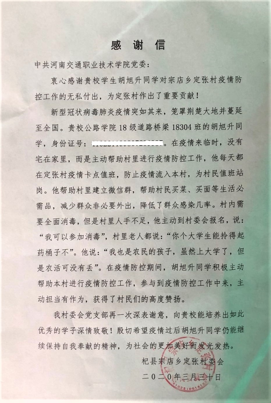 道路桥梁18304班胡旭升同学,在疫情来临时没有选择宅在家里,主动帮助村里开展疫情防控工作。他主动担当有作为,每天坚持到卡点值班,为村民买生活必需品,减少了群众的非必要外出,降低了村民的感染几率,获得了村民的高度赞扬。而像胡旭升这样的志愿者公路学院还有很多。