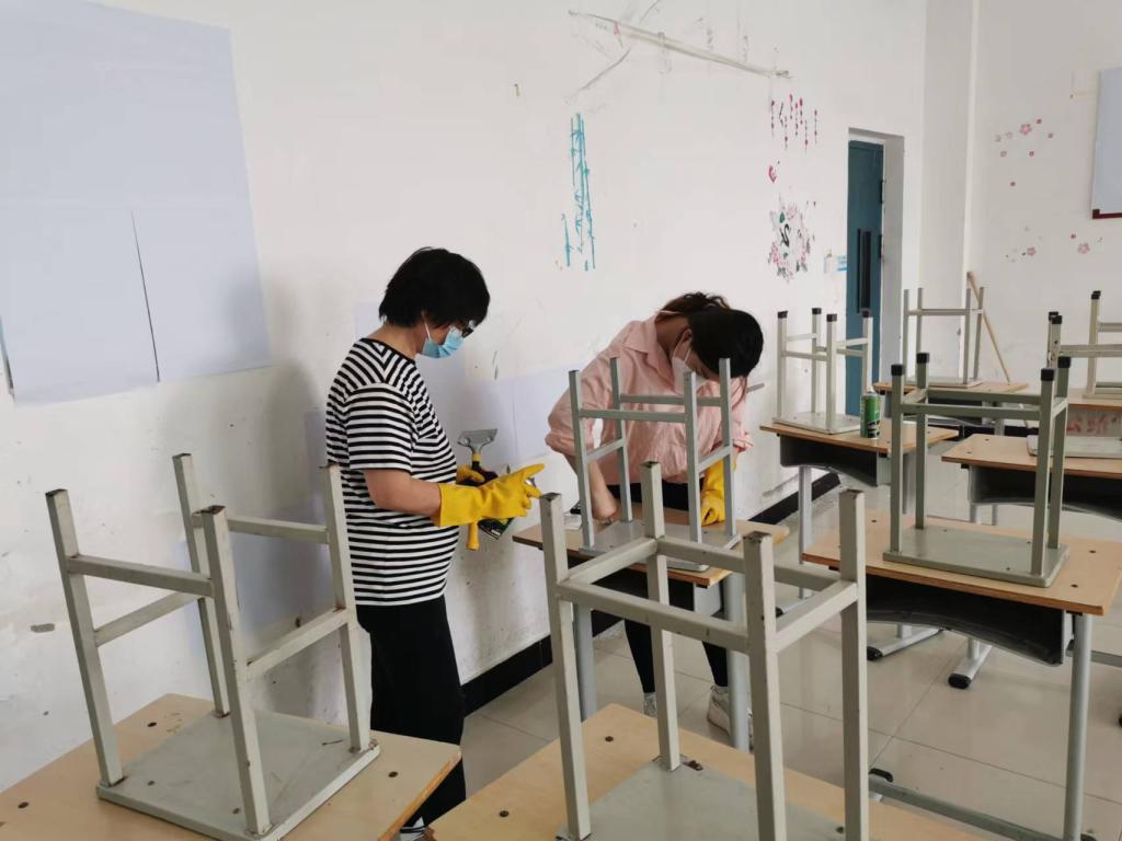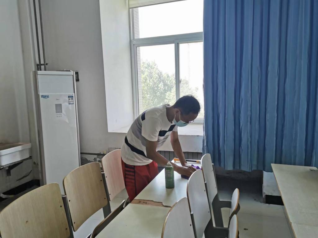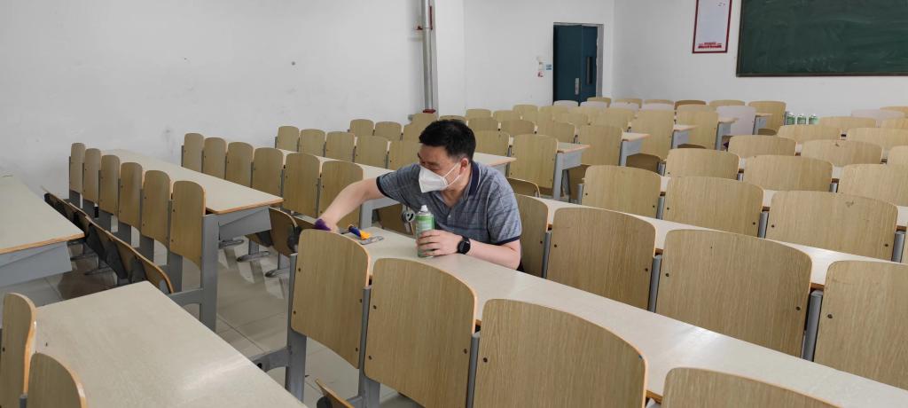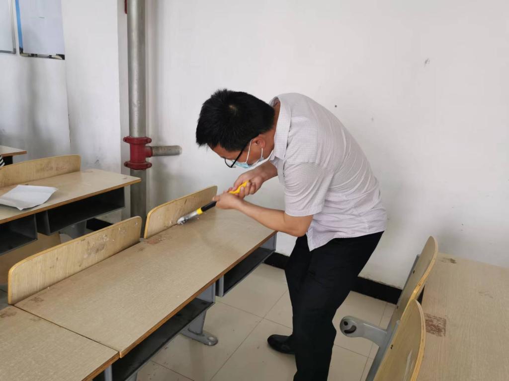 按照专升本考场标准化的要求,公路学院全体坐班人员利用抹布、小铲子、清除剂等工具对考场教室里的桌斗、桌椅下方、门后、墙角、空调、窗台等隐蔽位置的字迹、画迹、小广告贴纸进行了清除,对考场内的标语、板报进行了拆除或白纸遮盖,对室外走廊和卫生间进行了清检,确保干净整洁,并进行了落锁封闭、贴封条。