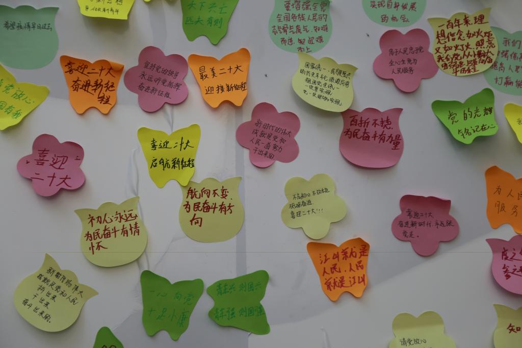 活动中同学们积极进言献策,写下了对大会成功召开的美好期待,有“不忘初心,不改本色,砥砺奋进,喜迎二十大,祝愿祖国繁荣昌盛”的美好愿景,有“希望疫情早日过去”的赤诚希冀,更有“请党放心,强国有我”的坚定信心,这些无不体现着当代青年对祖国前途命运的关注以及为国奉献的决心。