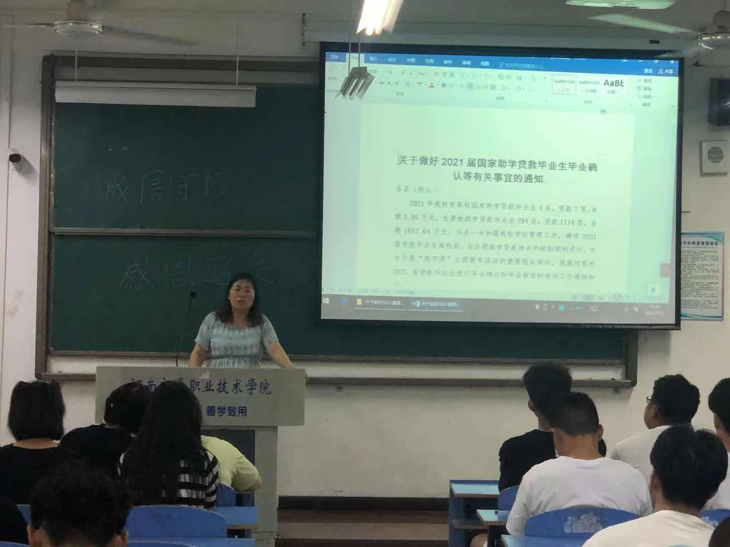 为进一步强化助学贷款学生诚信教育,完善国家助学贷款工作流程,提高学生还款意识、诚信意识和安全借贷意识,同时实现“资助育人”工作成效,5月29日,公路学院安利娟老师对学生进行了诚信还贷教育活动,学院全体贷款毕业生参与了此次会议。