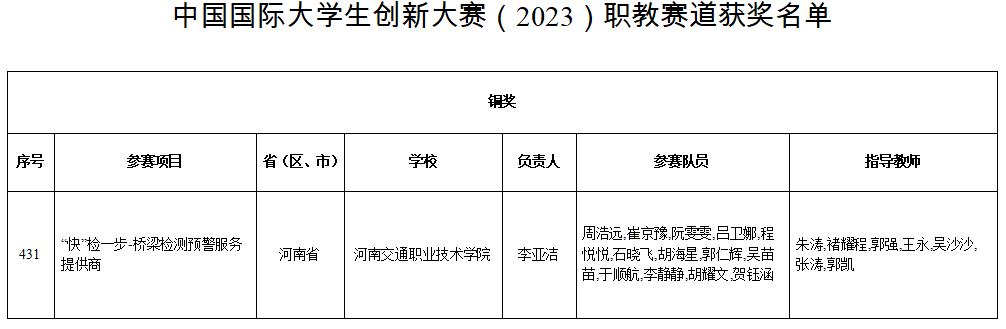 2023年5月至12月6日教育部等12个部门会同天津市人民政府共同在天津大学举办中国国际大学生创新大赛(2023)。近日教育部公布了大赛获奖名单,我校学生周浩远、崔京豫、阮雯雯、吕卫娜等组成的参赛团队;教师朱涛、褚耀程、郭强、王永、吴沙沙、张涛、郭凯等指导的作品《“快”检一步——桥梁检测预警服务提供商》在652个参赛项目中脱颖而出,获得中国国际大学生创新大赛(2023)职教赛道铜奖。
