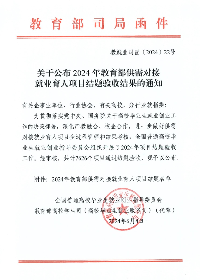 近日,教育部供需对接就业育人平台发布《关于公布2024年教育部供需对接就业育人项目结题验收结果的通知》,经审核,我院与长沙计支宝信息科技有限公司联合开展“定向人才培养培训-数字化合约计量人才”项目,通过结题验收。