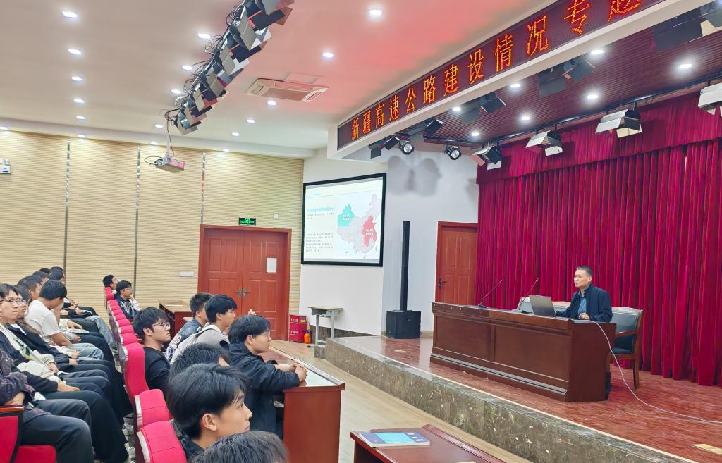 报告会上,援疆教师孟国东凭借其在新疆的丰富实践经验和专业知识,为学生们生动地展现了新疆高速公路建设的宏伟画卷。孟老师围绕新疆地理与人文、工作与生活、新疆高速公路建设特点三个方面进行报告。详细介绍了新疆独特的地理环境给高速公路建设带来的挑战,如广袤的沙漠、高耸的山脉和极端的气候条件等。同时,分享了建设者们如何克服重重困难,运用先进的技术和创新的理念,确保高速公路的顺利施工和高质量完成。