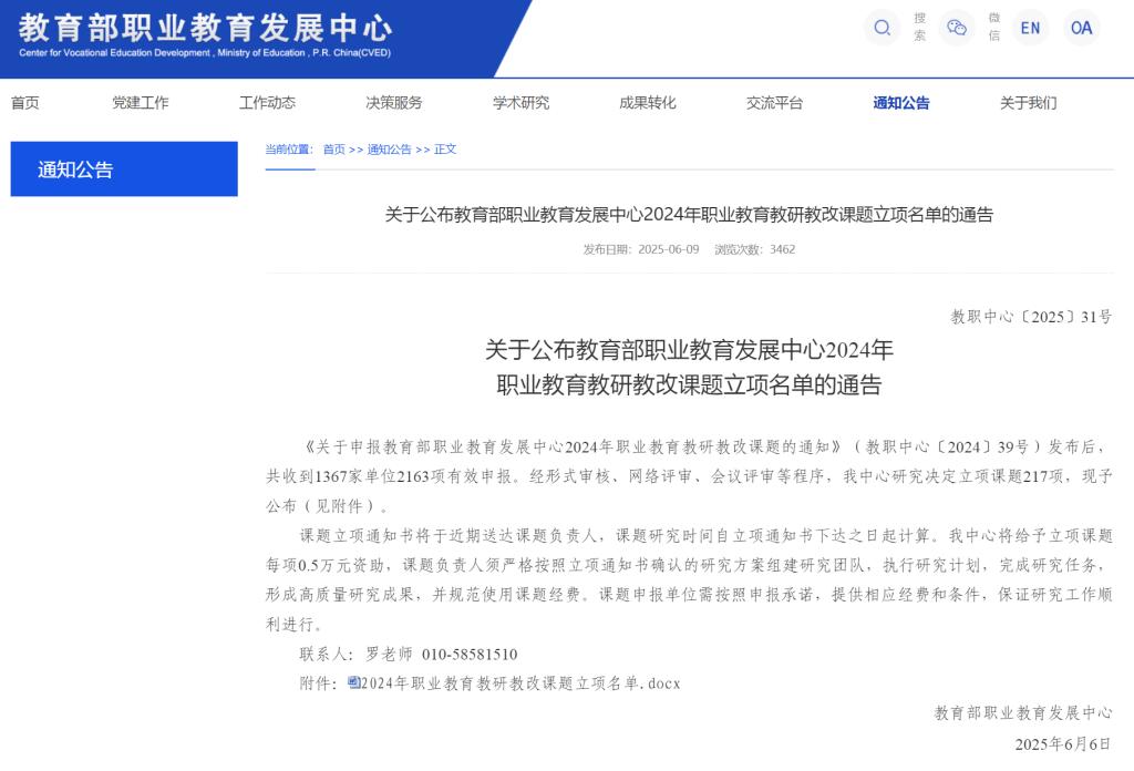 据悉,教育部职业教育发展中心共收到来自全国1367家单位的2163项有效申报,经形式审核、网络评审、会议评审等程序最终确定立项课题217项。