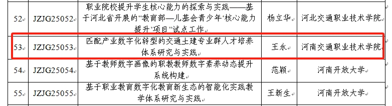 近日,教育部职业教育发展中心发布《关于公布教育部职业教育发展中心2024年职业教育教研教改课题立项名单的通告》(教职中心〔2025〕31号)。学校申报的《匹配产业数字化转型的交通土建专业群人才培养体系研究与实践》课题成功获批立项。