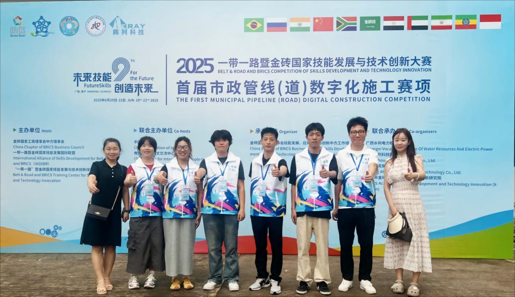 近日,2025“一带一路”暨金砖国家技能发展与技术创新大赛——首届市政管线(道)数字化施工赛项总决赛在广西南宁举行,由学校公路学院庆宏斌、杜嘉康、许来浩、杜晶珂、田宸溪、李敏嘉6位同学组成的三支队伍,从全国高职院校近200支精英队伍中脱颖而出,勇夺总决赛三项一等奖,学校获评最佳组织奖,蒋丽君、王丹等老师荣获优秀指导教师。